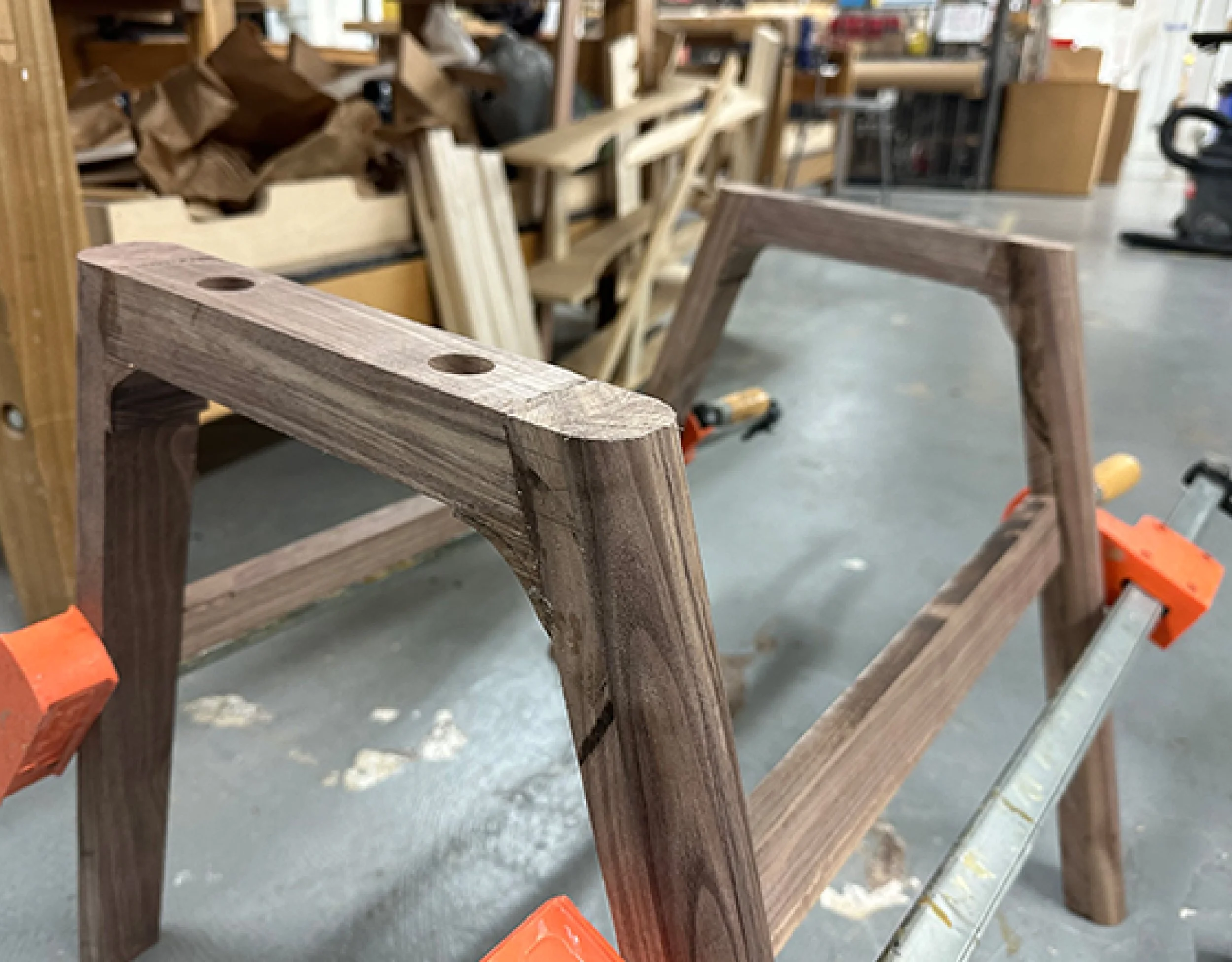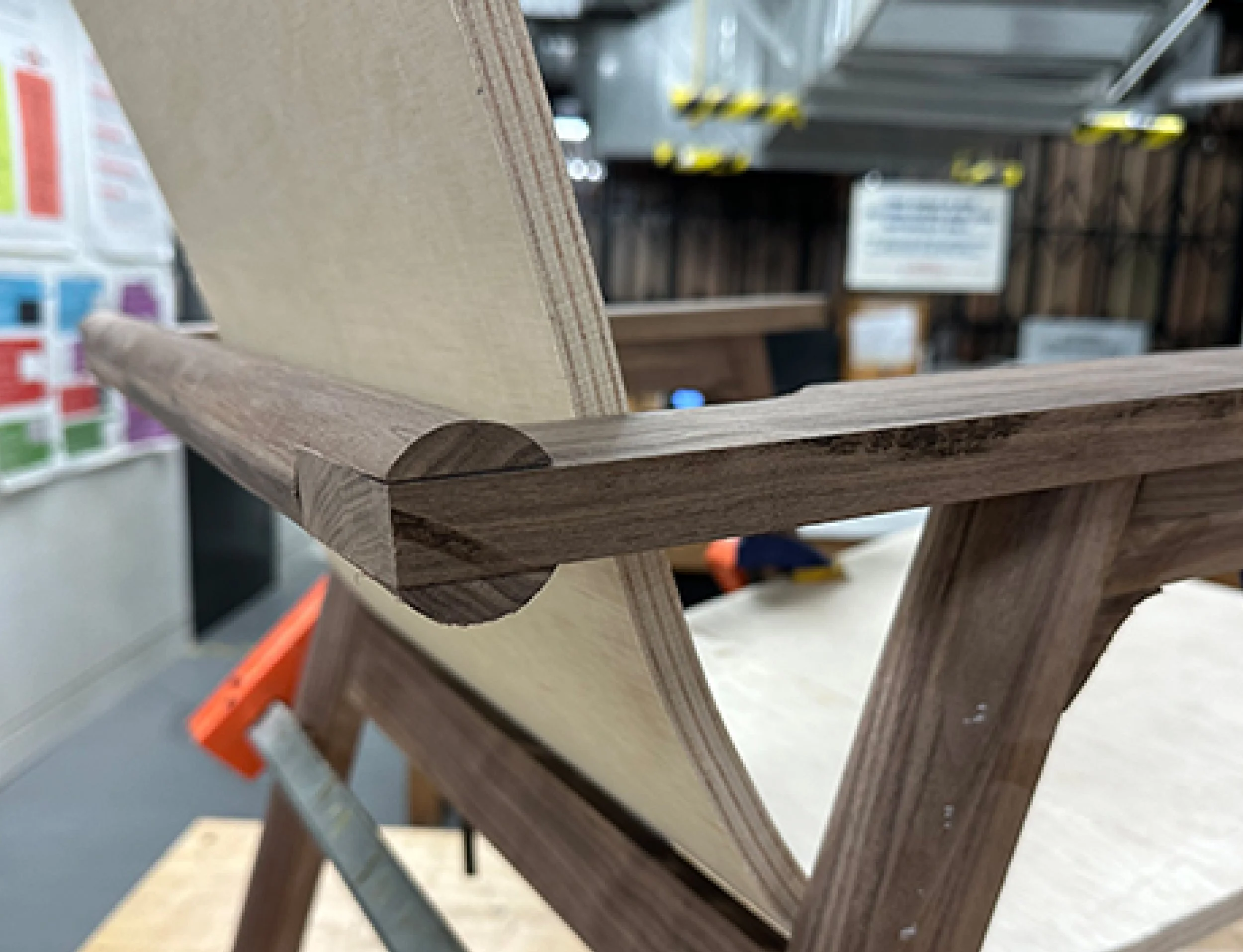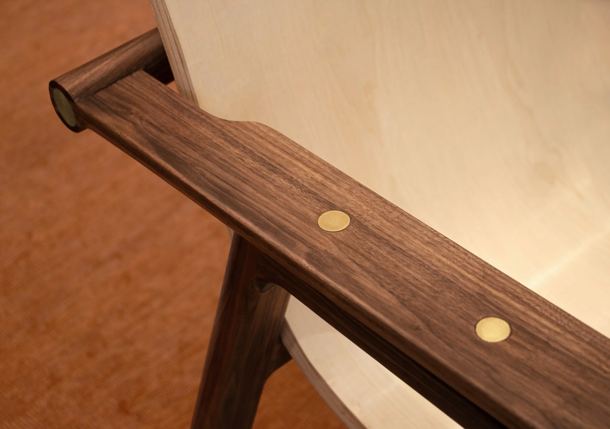 The handle at the back and armrests were connected using a simple yet sturdy bridle joint, reinforced with 5-inch woodworking screws inside for additional support. Other joints were connected using Domino tenons for secure attachment.
