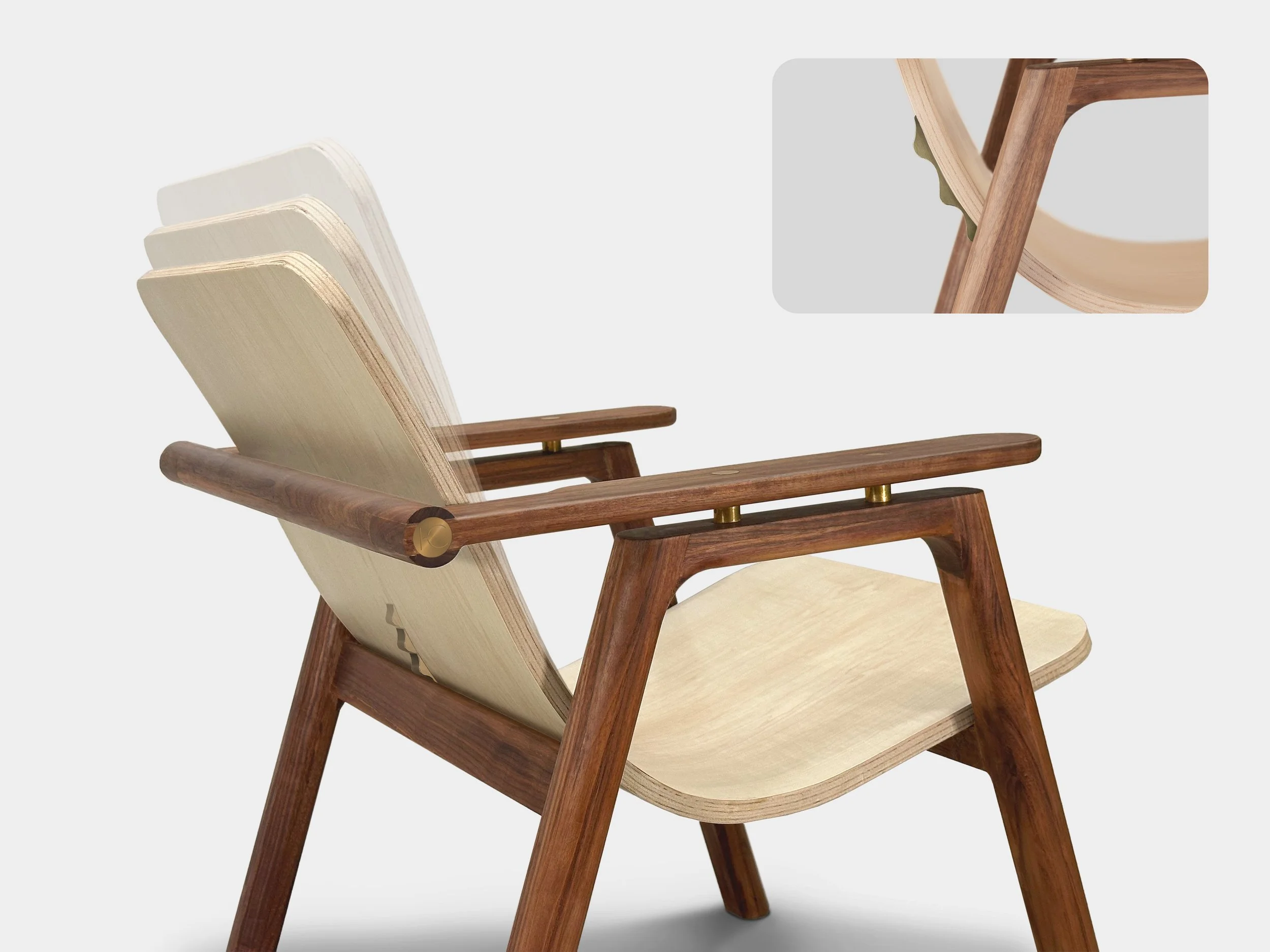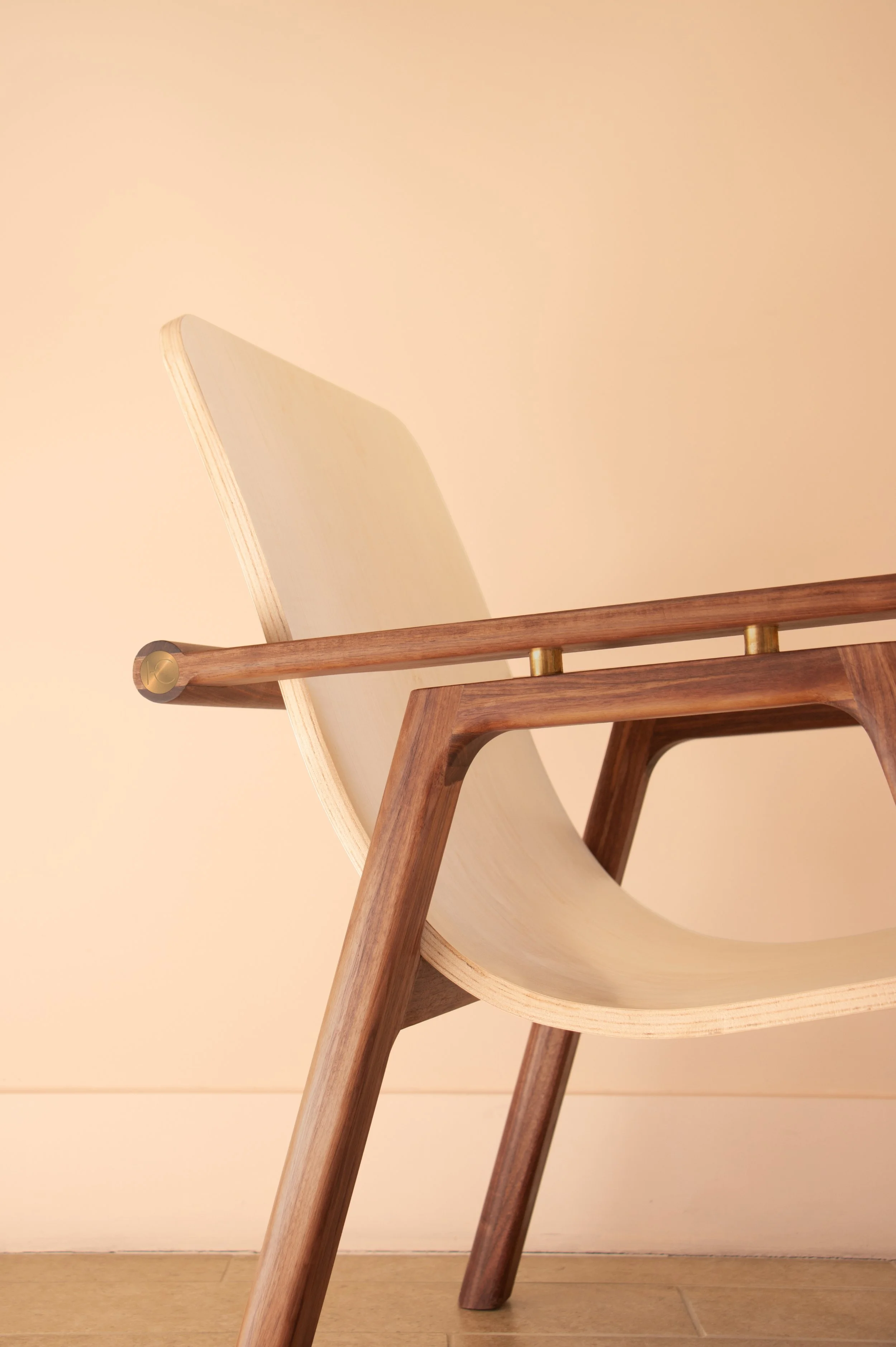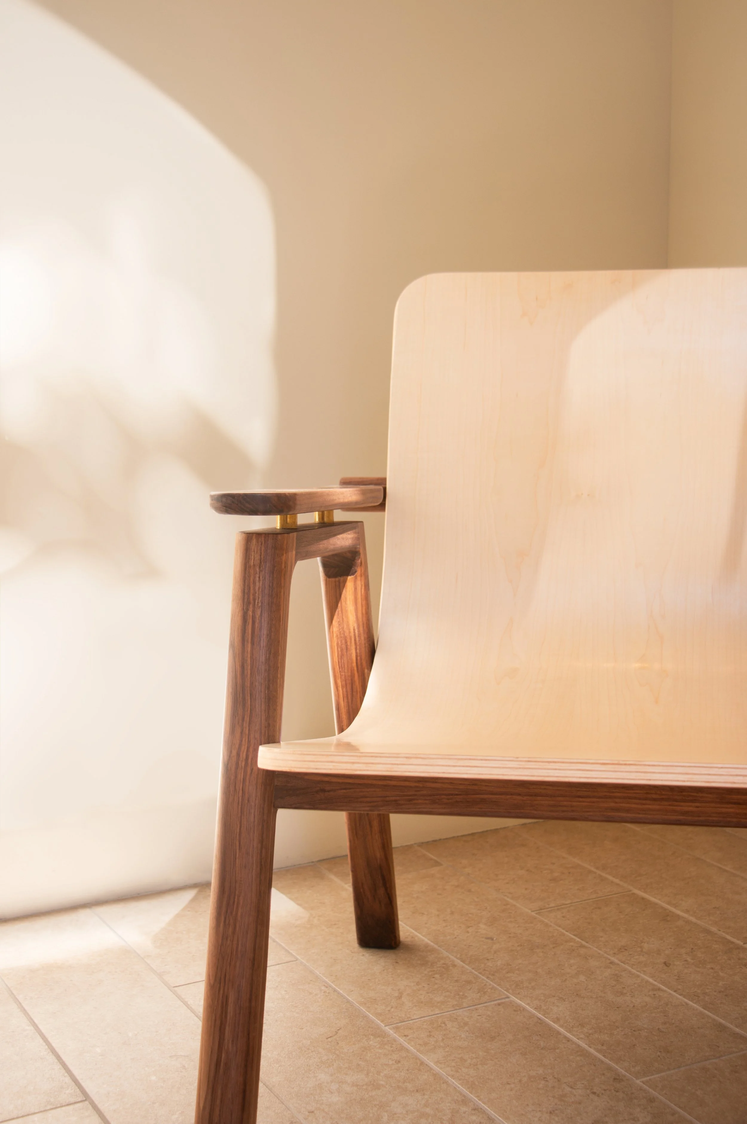 Due to the lack of steam-bending equipment in the studio, the seat was crafted by laminating three layers of wiggle wood and shaping them with a mold. Once the form was set, a veneer layer was added for aesthetic enhancement and structural reinforcement.