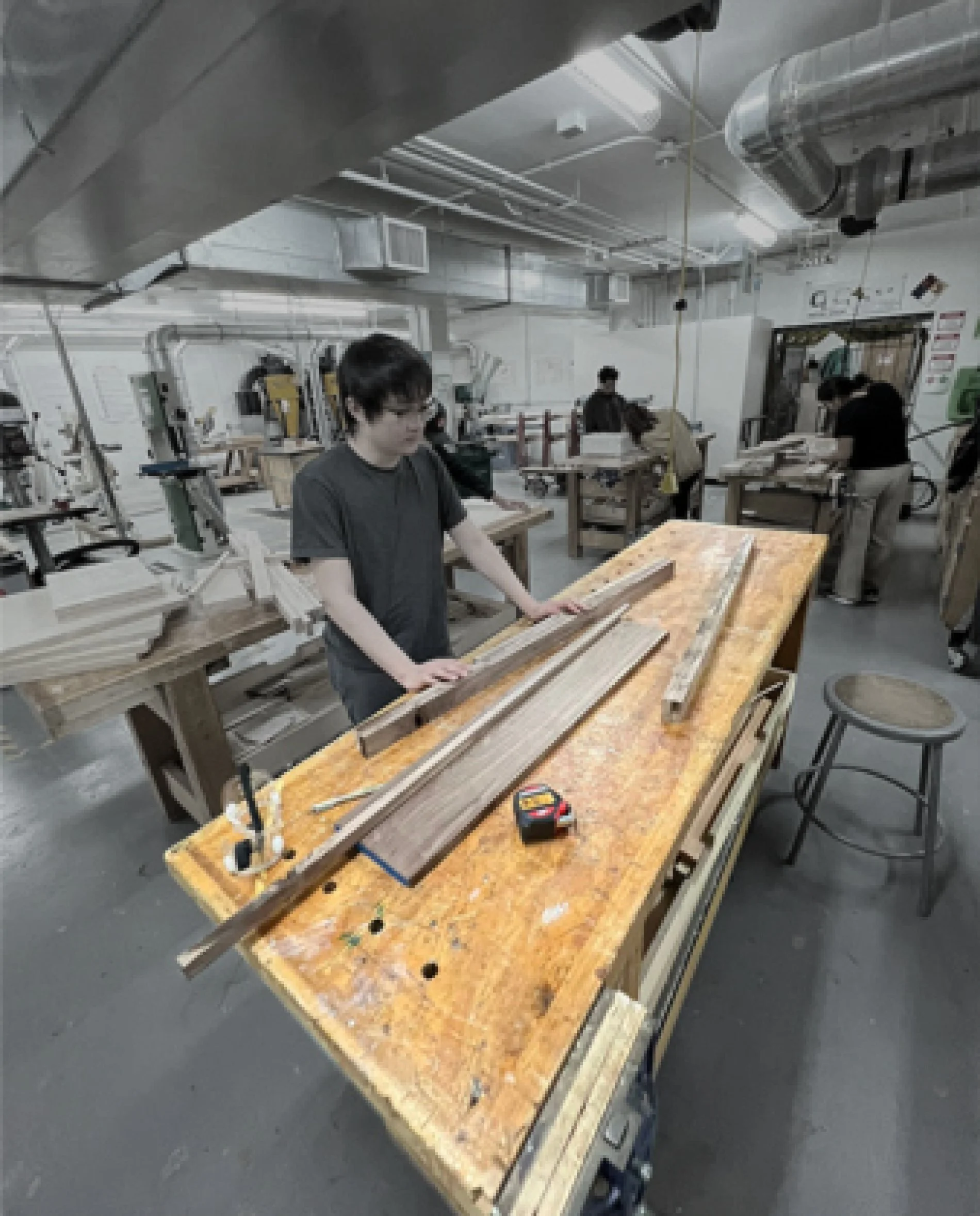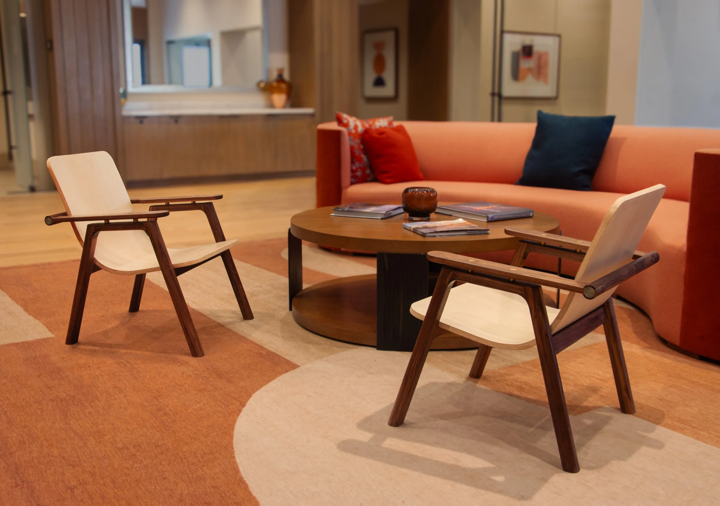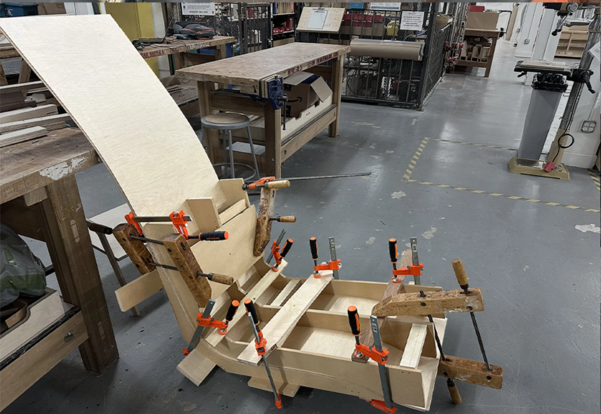 Due to the lack of steam-bending equipment in the studio, the seat was crafted by laminating three layers of wiggle wood and shaping them with a mold. Once the form was set, a veneer layer was added for aesthetic enhancement and structural reinforcement.