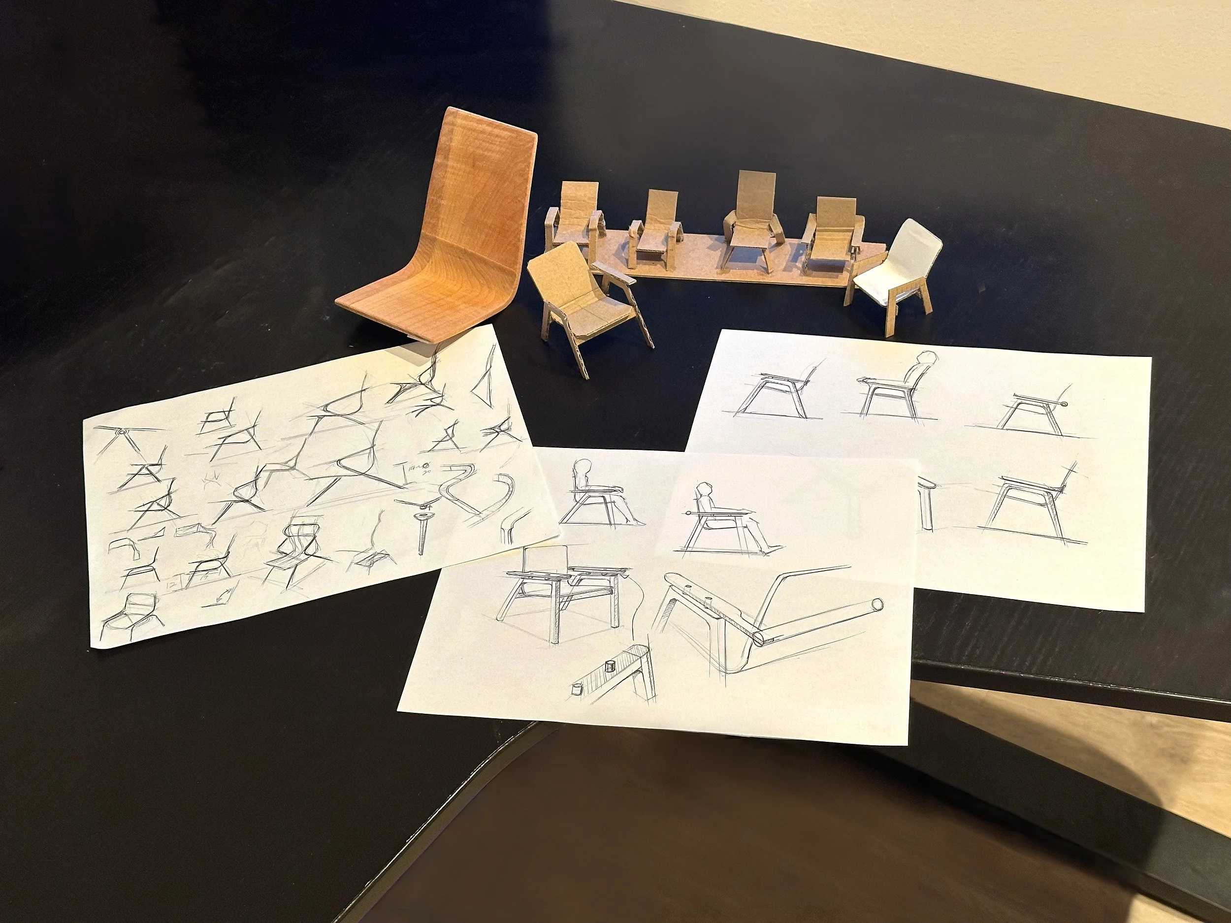 Sketching and model-making progressed simultaneously throughout the design process. Early concepts were refined digitally using Gravity Sketch to perfect angles and proportions, while detailed sketches were later drawn from these refined 3D models.