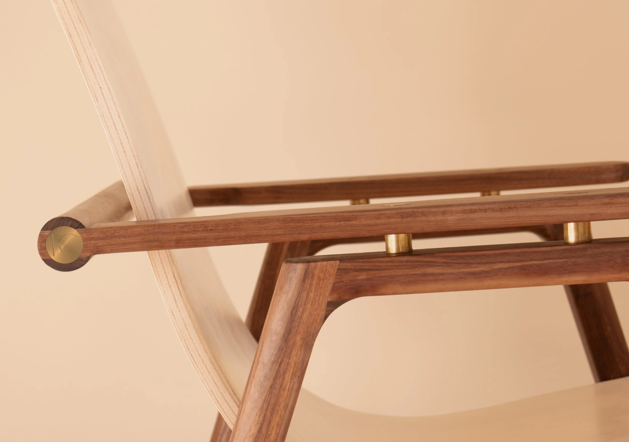 The chair’s proportions and the rear handle are intentionally shifted backward, inviting users to lean into relaxation intuitively. The seat’s curve naturally draws attention, guiding the eye toward the elegant brass logo detail. This embellishment conceals structural elements inside the rear handle, enhancing both strength and visual depth.