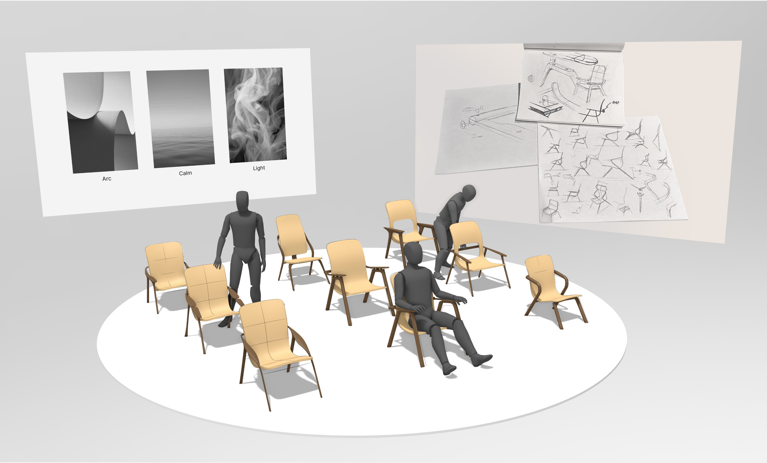 The Tranquil Chair embodies the concepts of arc, calm, and light. Arc represents its smooth curves, providing ergonomic support with a natural fit. Calm reflects the quiet form and offers a peaceful retreat after a busy day. Light refers to both its visual and actual weight with a flowing, ethereal design, making it perfect for creating serene, relaxing spaces.